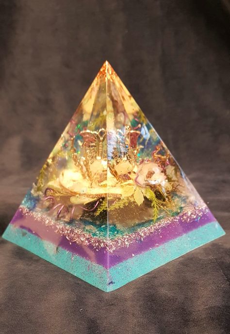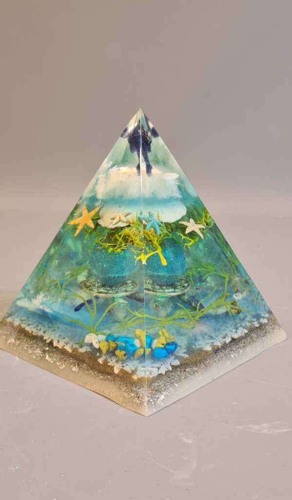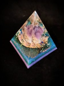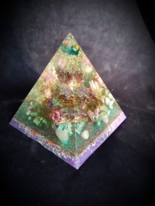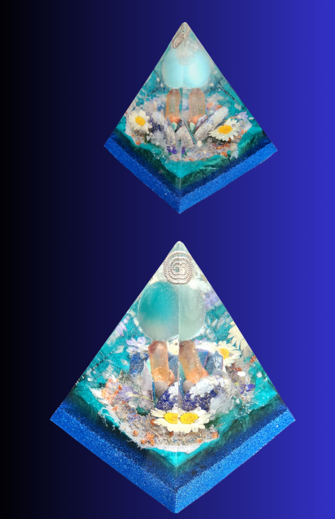 Met liefde maak ik de fundamenten van licht, deze piramides bouw ik zorgvuldig in vloeibare lagen epoxy op met edelstenen, kristallen, kopervezels en materialen uit de natuur.