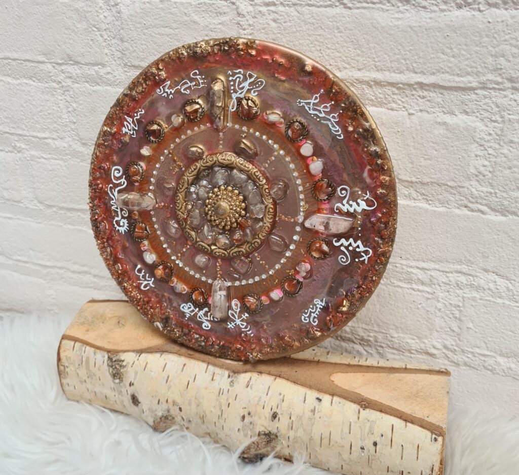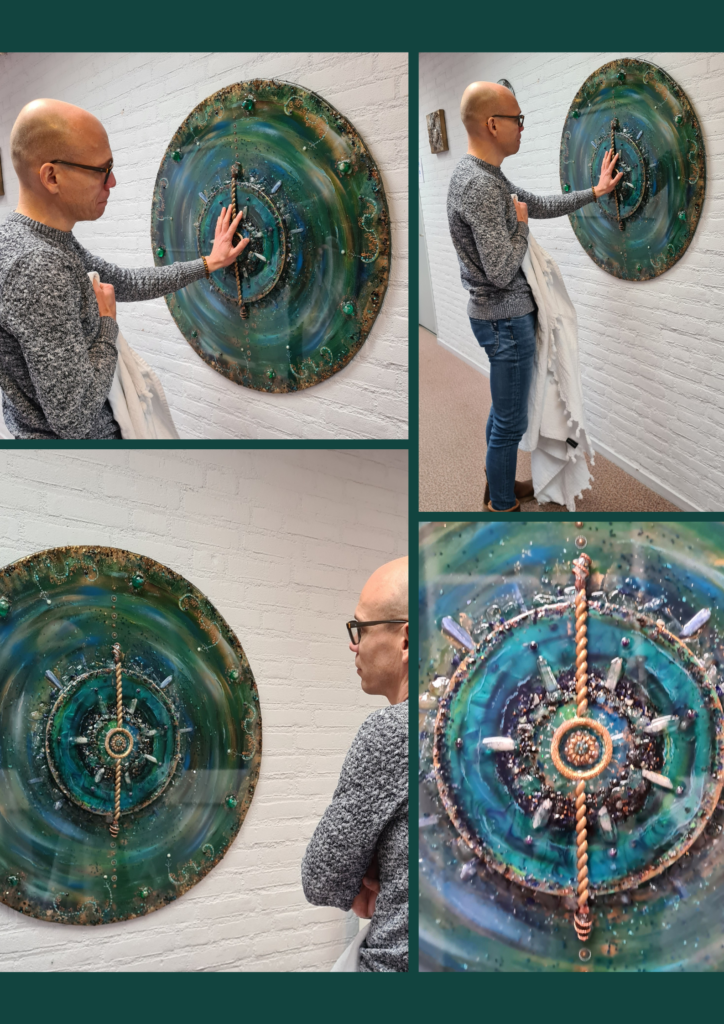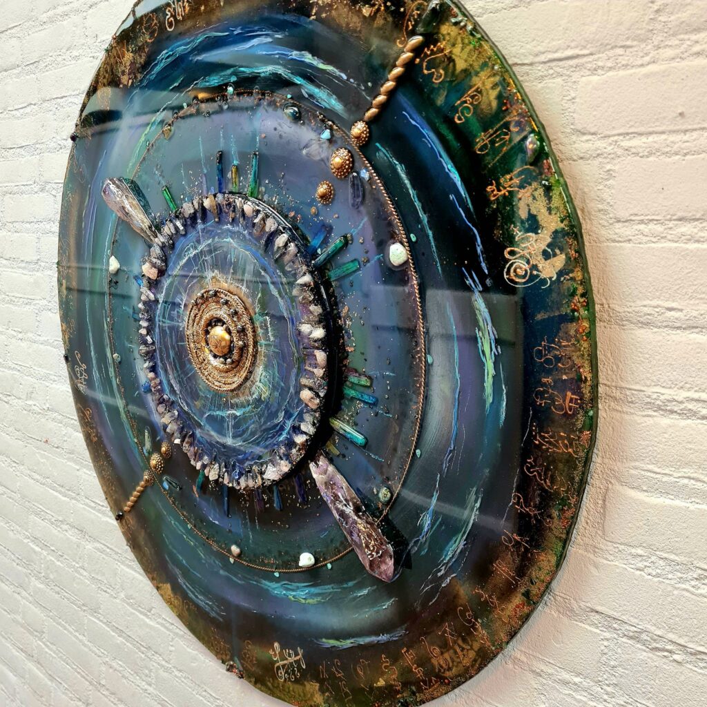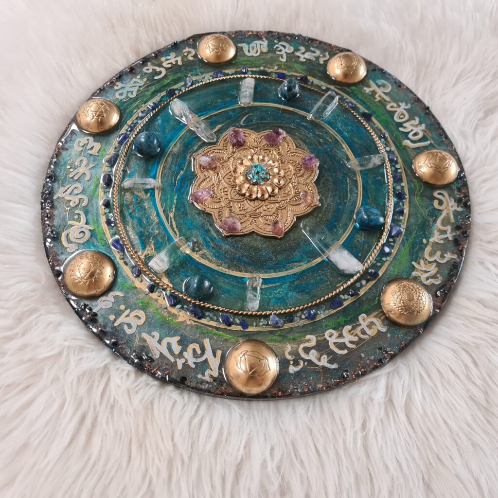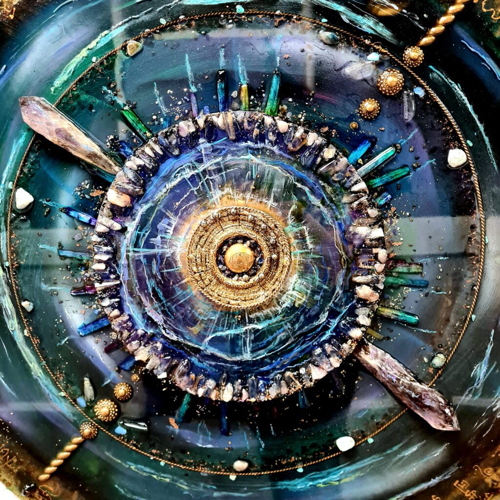 De kristallen en edelstenen die op het kunstwerk zijn verwerkt zijn in harmonie met het kosmisch veld uitgelijnd. Elke cirkel, elk lijntje is in verbinding gebracht met de lichtcoderingen die in jouw persoonlijk kunstwerk zijn aangebracht.