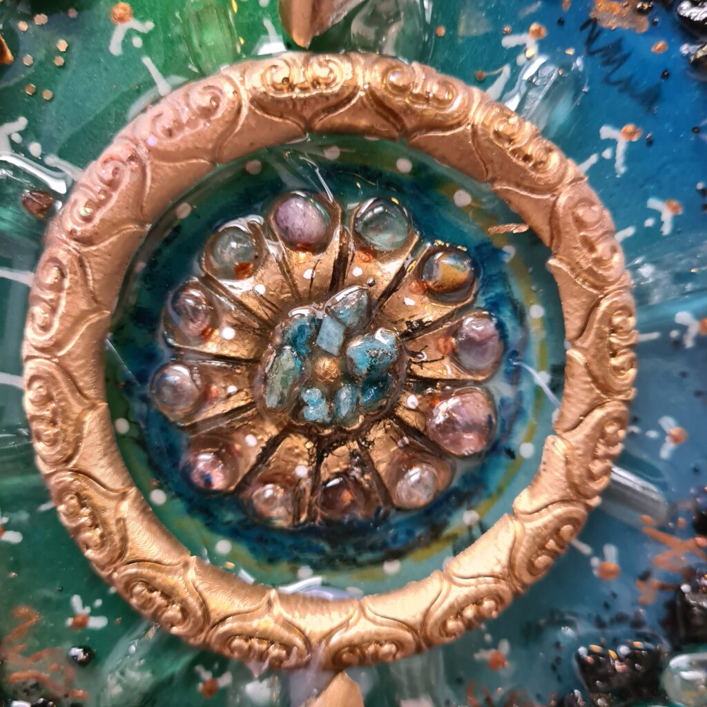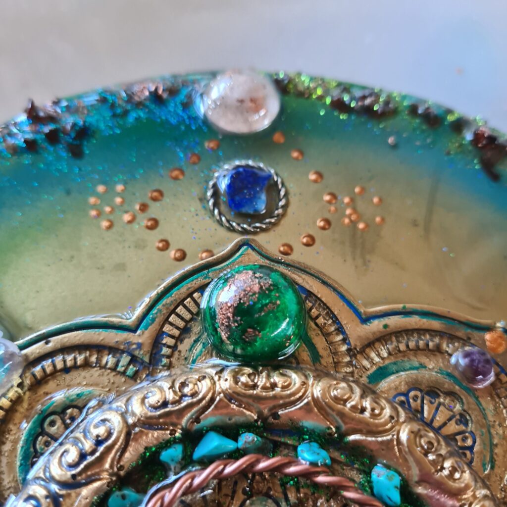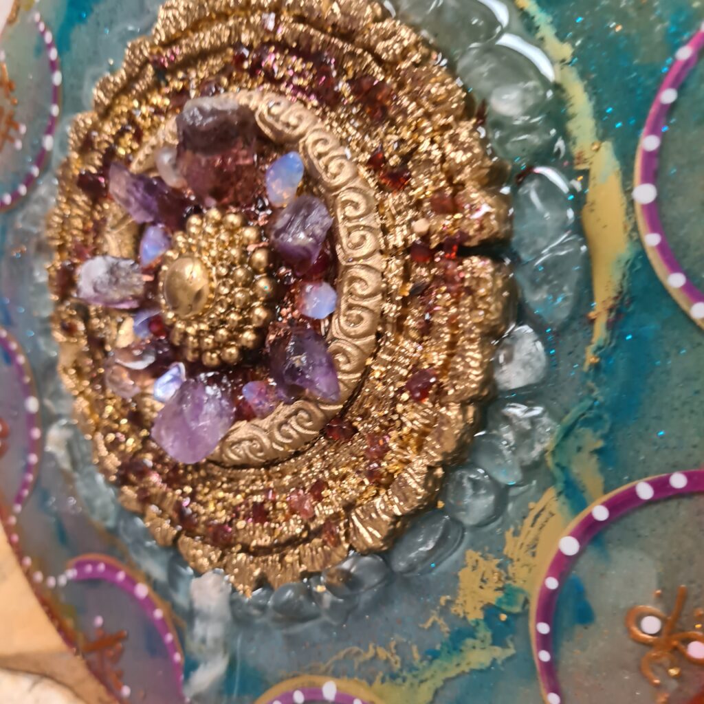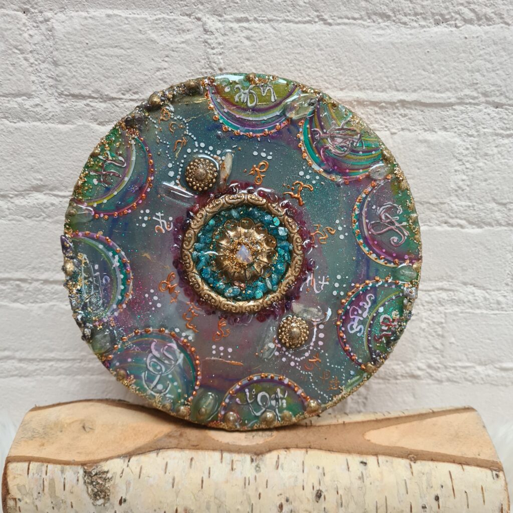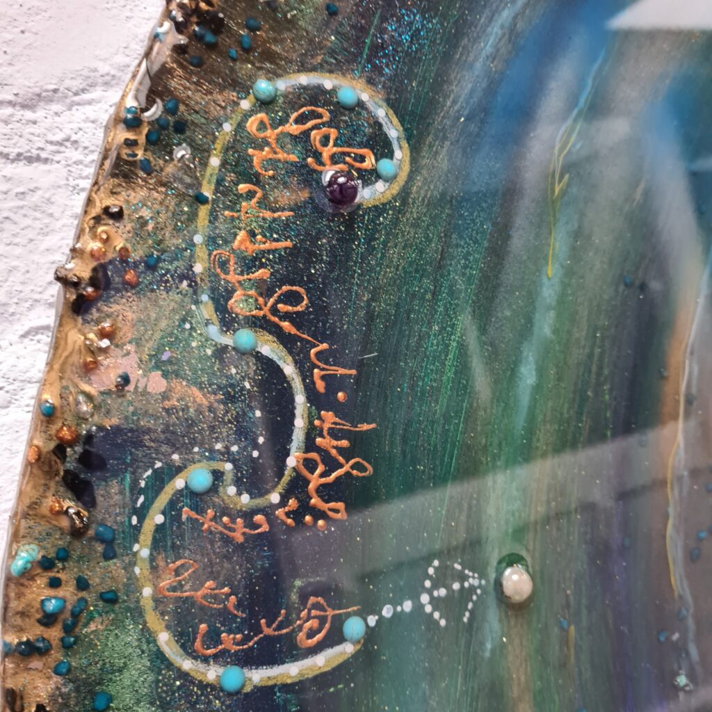 De kristallen en edelstenen die op het kunstwerk zijn verwerkt zijn in harmonie met het kosmisch veld uitgelijnd. Elke cirkel, elk lijntje is in verbinding gebracht met de lichtcoderingen die in jouw persoonlijk kunstwerk zijn aangebracht.