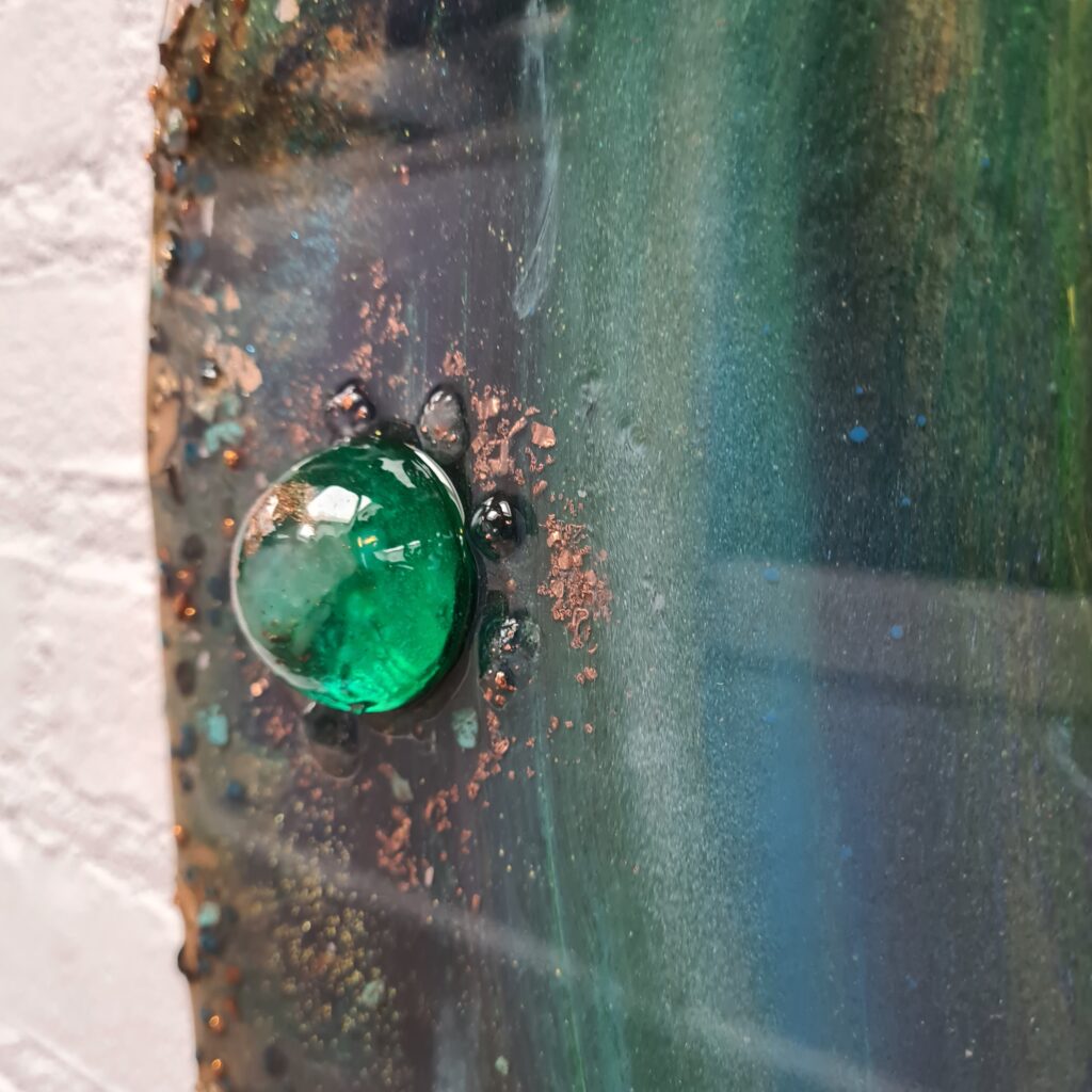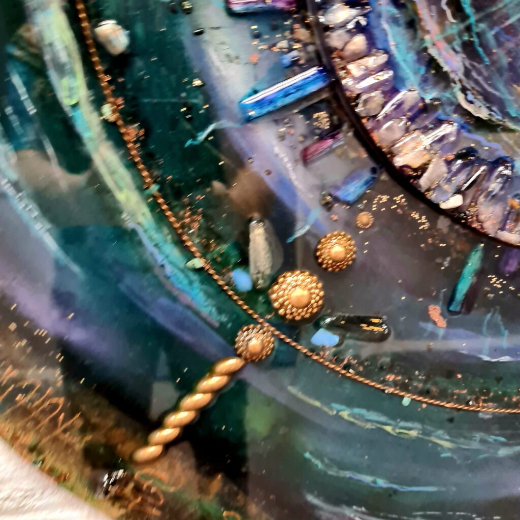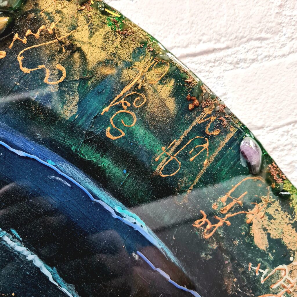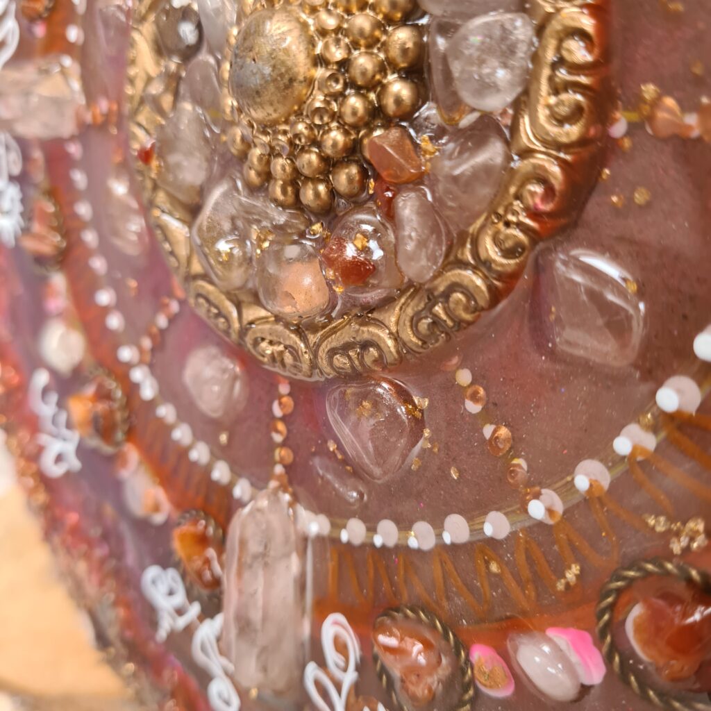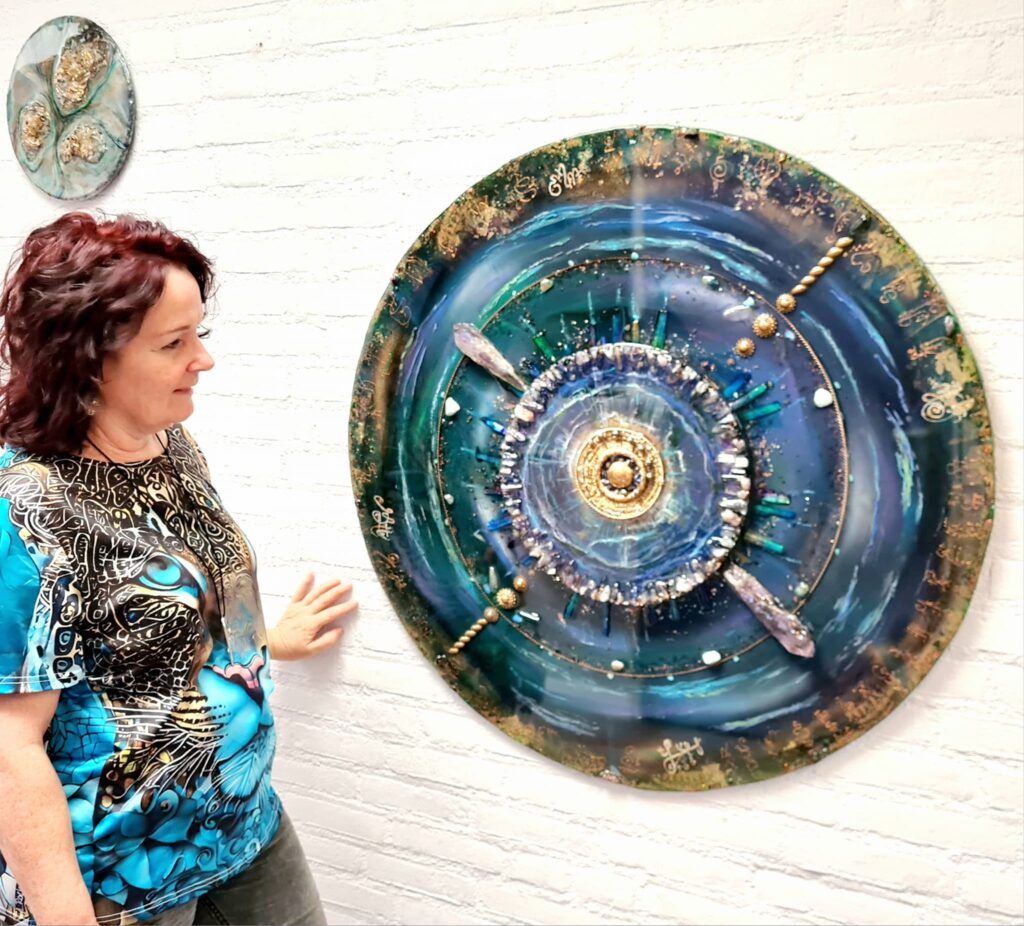 De kristallen en edelstenen die op het kunstwerk zijn verwerkt zijn in harmonie met het kosmisch veld uitgelijnd. Elke cirkel, elk lijntje is in verbinding gebracht met de lichtcoderingen die in jouw persoonlijk kunstwerk zijn aangebracht.