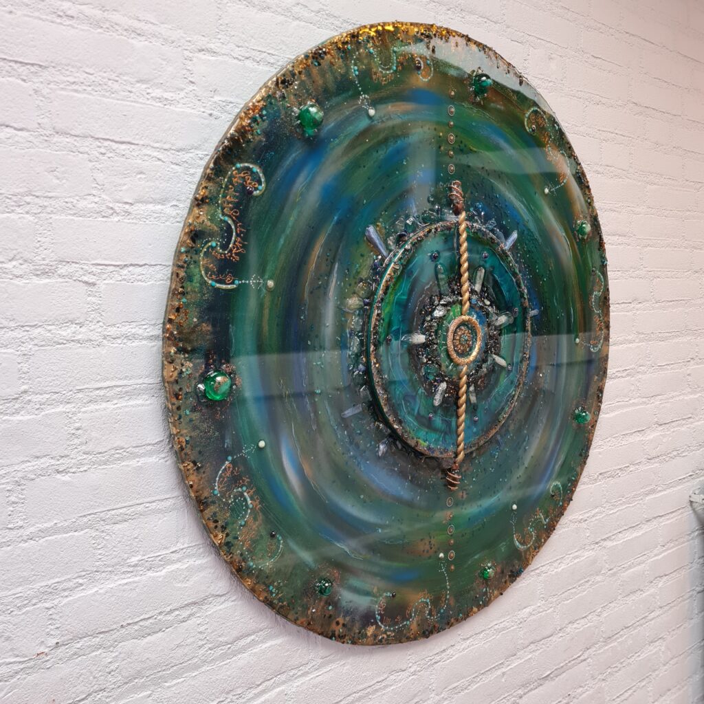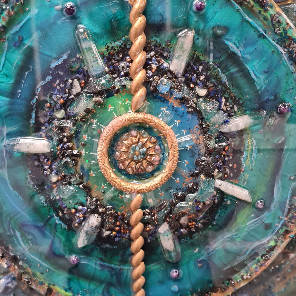 90 cm basis vanuit hout, met 7 lagen epoxy, meester kristallen/edelstenen/bergkristallen/koper/2 – tensor ringen. In het midden een luxe template (B) met een orgone basis. Inclusief bevestiging van metalen ophangsysteem.