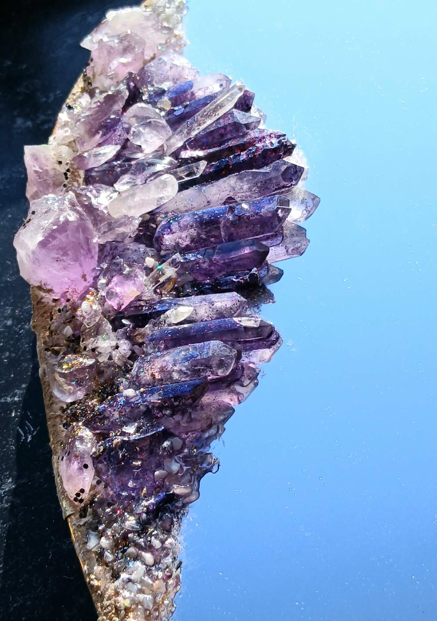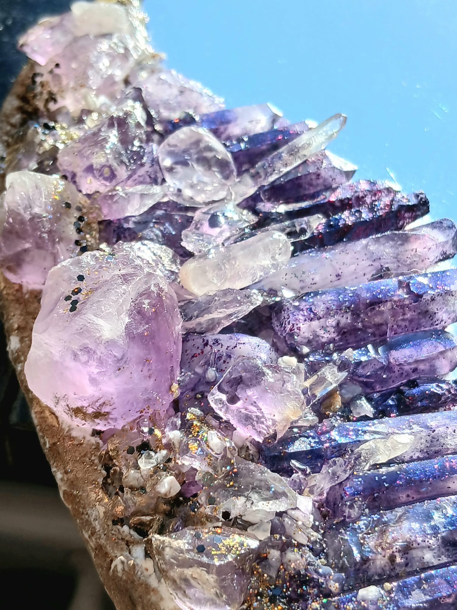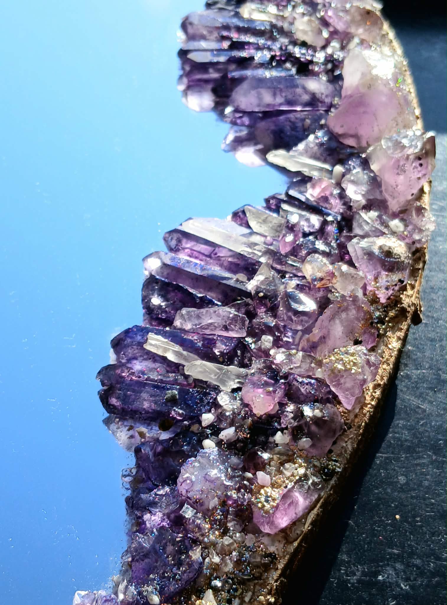 De punten hebben 1 nacht een bad gehad van een natuurlijke lila/paarse coating. Ik werk enkel met echte edelstenen en kristallen, die in mijn kunst geblend worden en tot eenheid gebracht worden.. Geen vooraf bedacht plan, enkel mijn intuïtie volgen. Ik gebruik dus ook geen nep kristallen, omdat ik de frequentie van mijn kunst belangrijk vind.