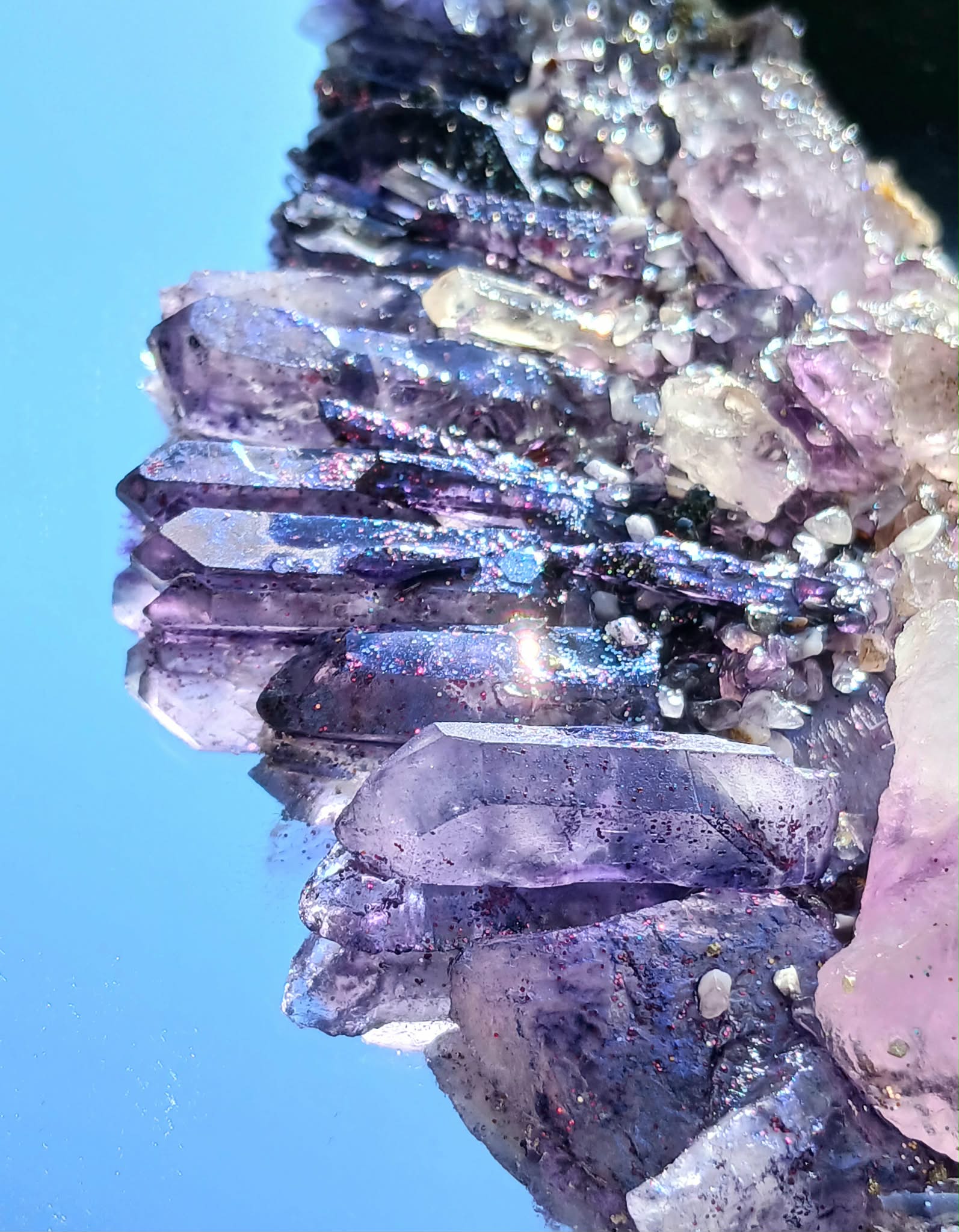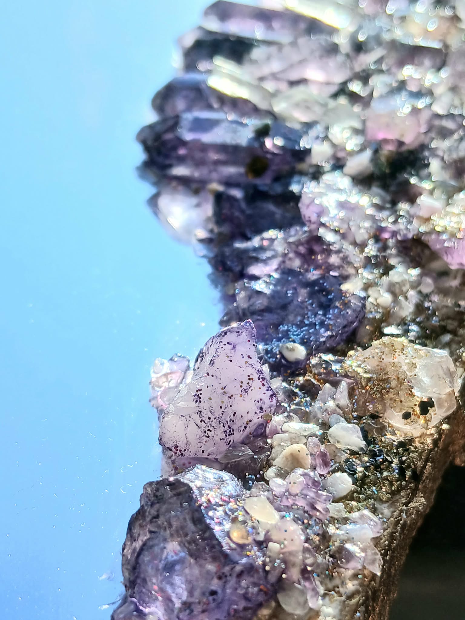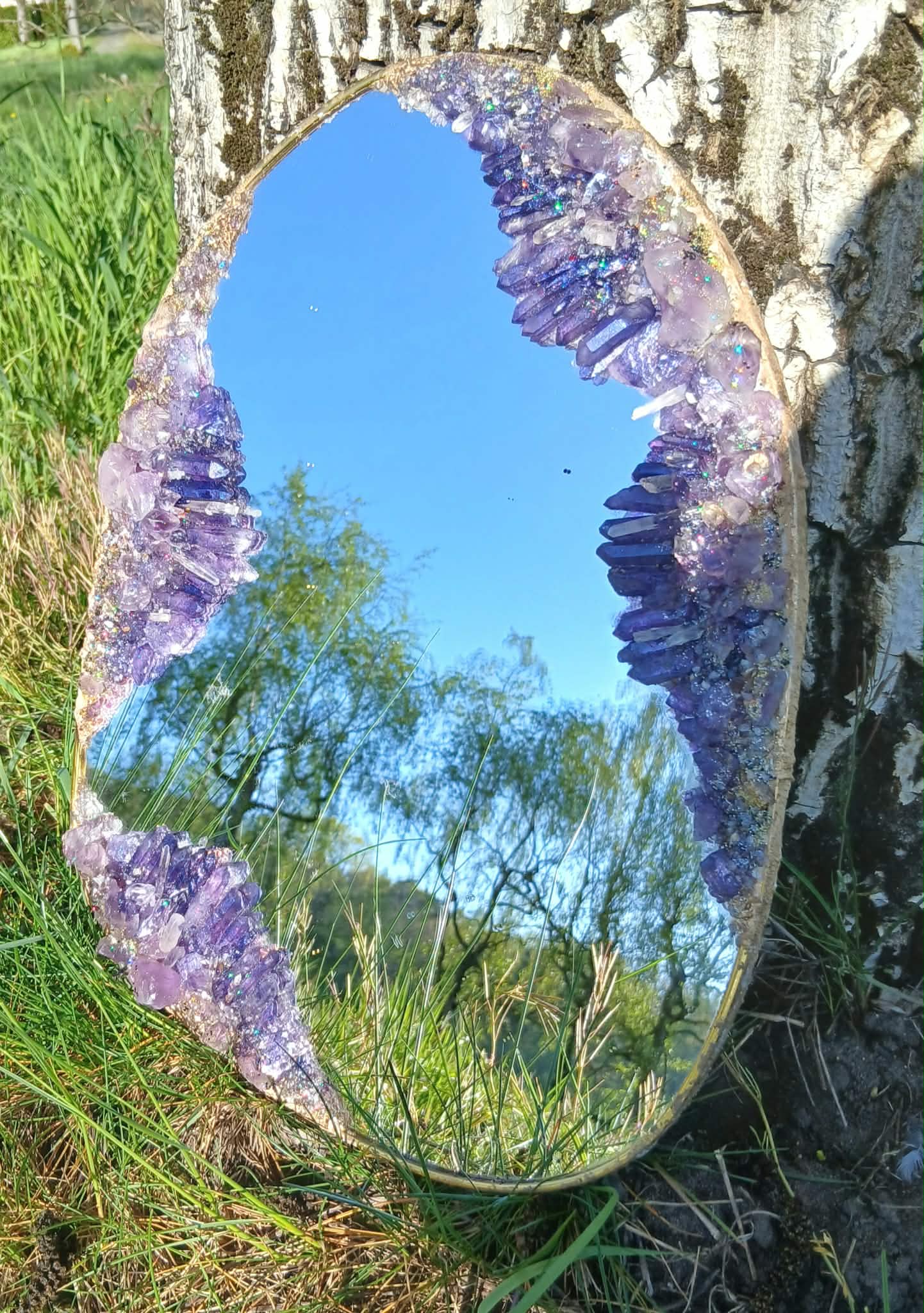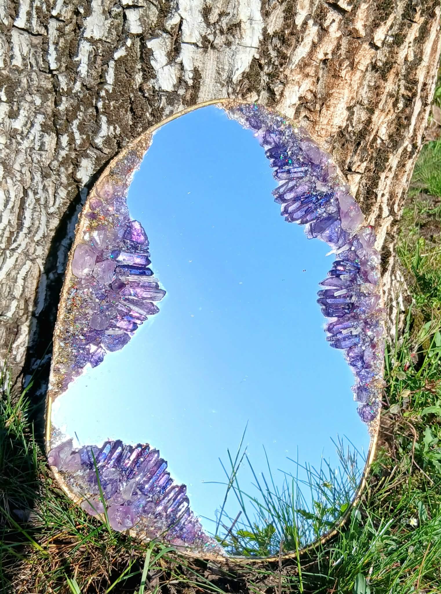 De punten hebben 1 nacht een bad gehad van een natuurlijke lila/paarse coating. Ik werk enkel met echte edelstenen en kristallen, die in mijn kunst geblend worden en tot eenheid gebracht worden.. Geen vooraf bedacht plan, enkel mijn intuïtie volgen. Ik gebruik dus ook geen nep kristallen, omdat ik de frequentie van mijn kunst belangrijk vind.