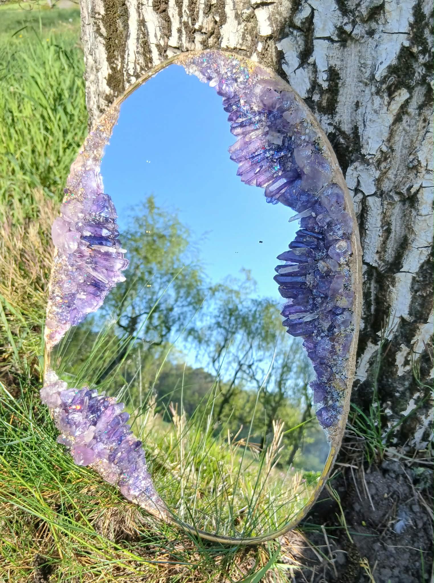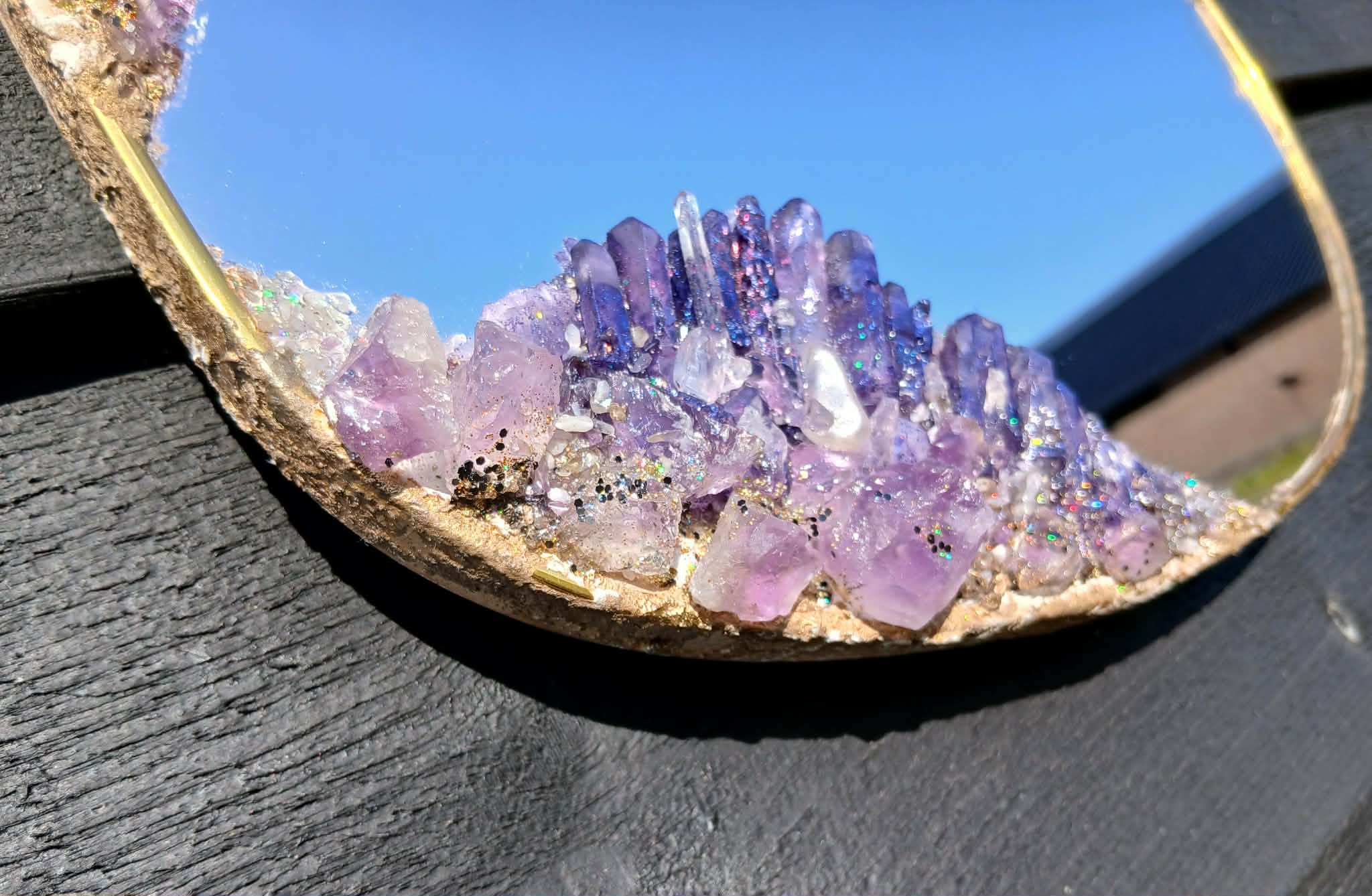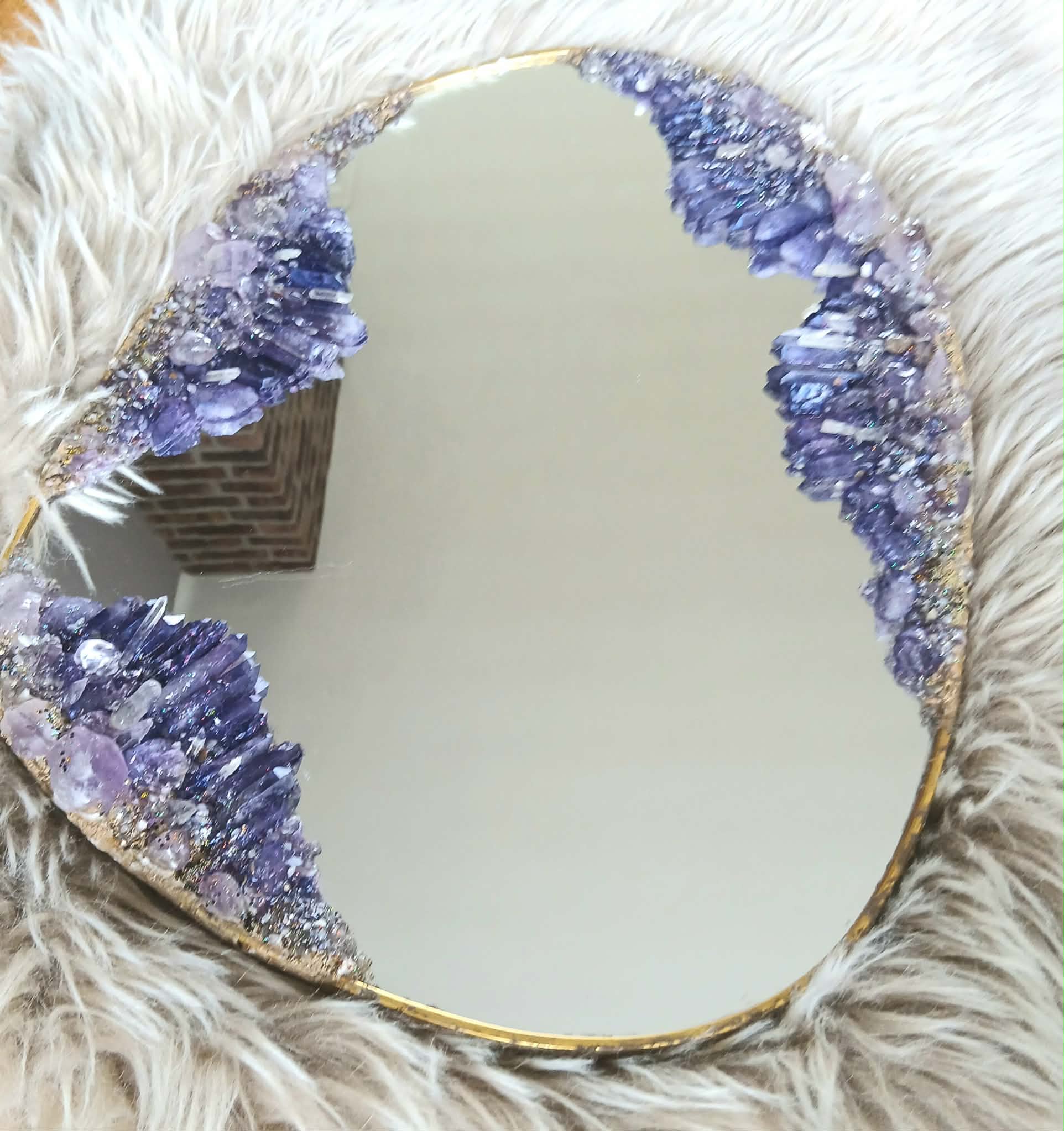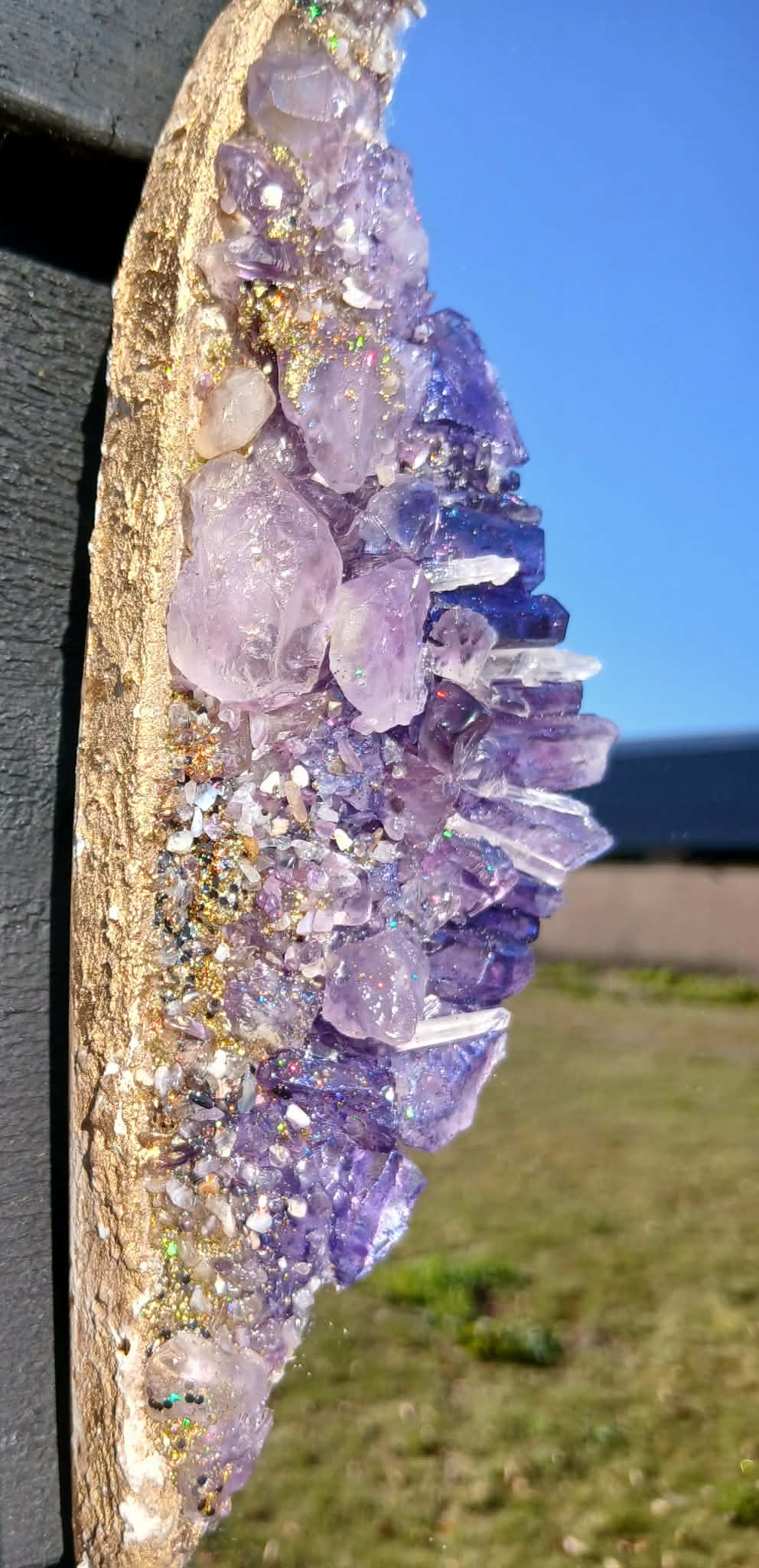 Prachtige geode spiegel vol met ruwe Amethist, Bergkristal punten, Ruwe rozenkwarts, afgewerkt met een gouden randje. Sjiek, zacht, mooi om je interieur mee te stylen.