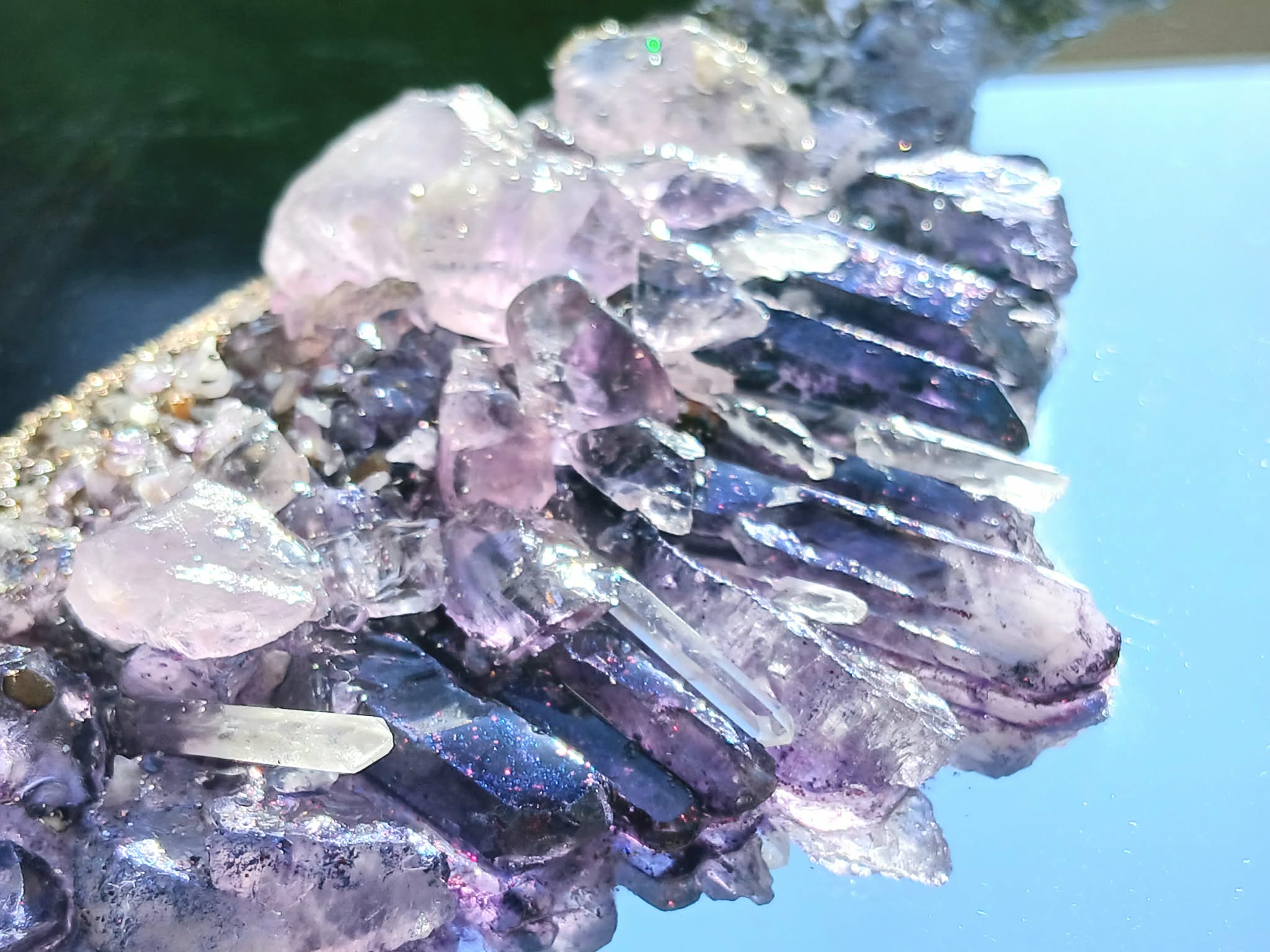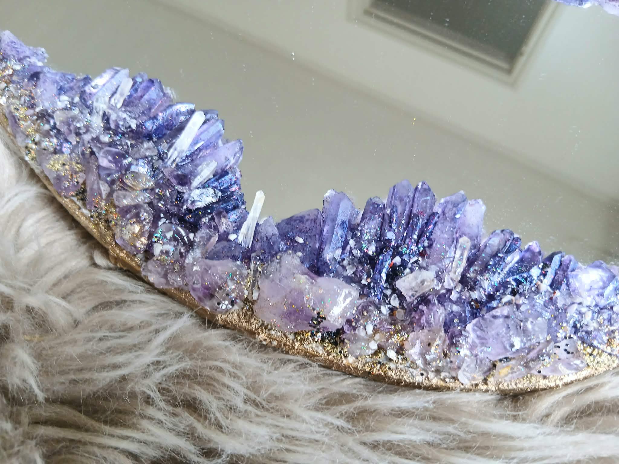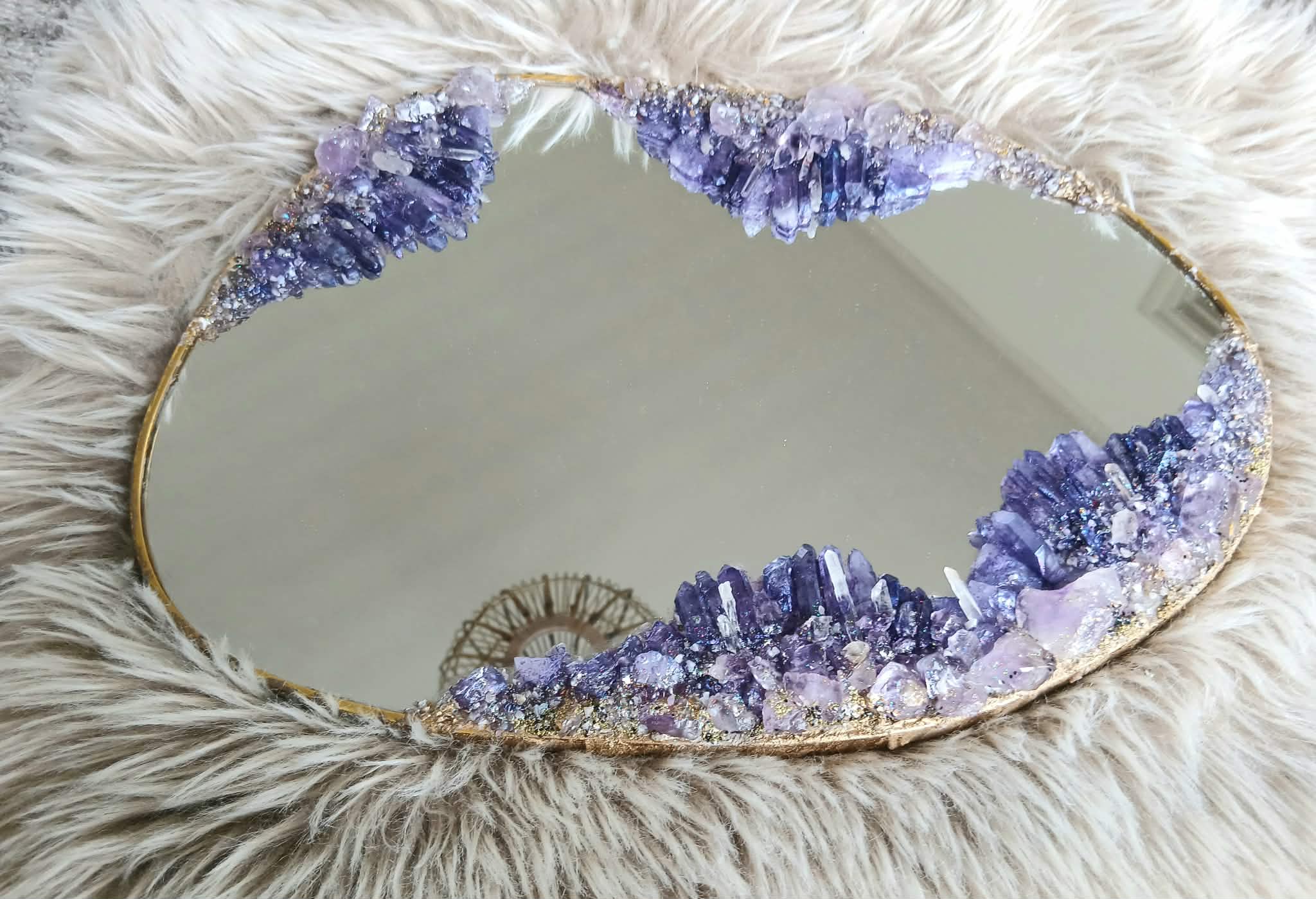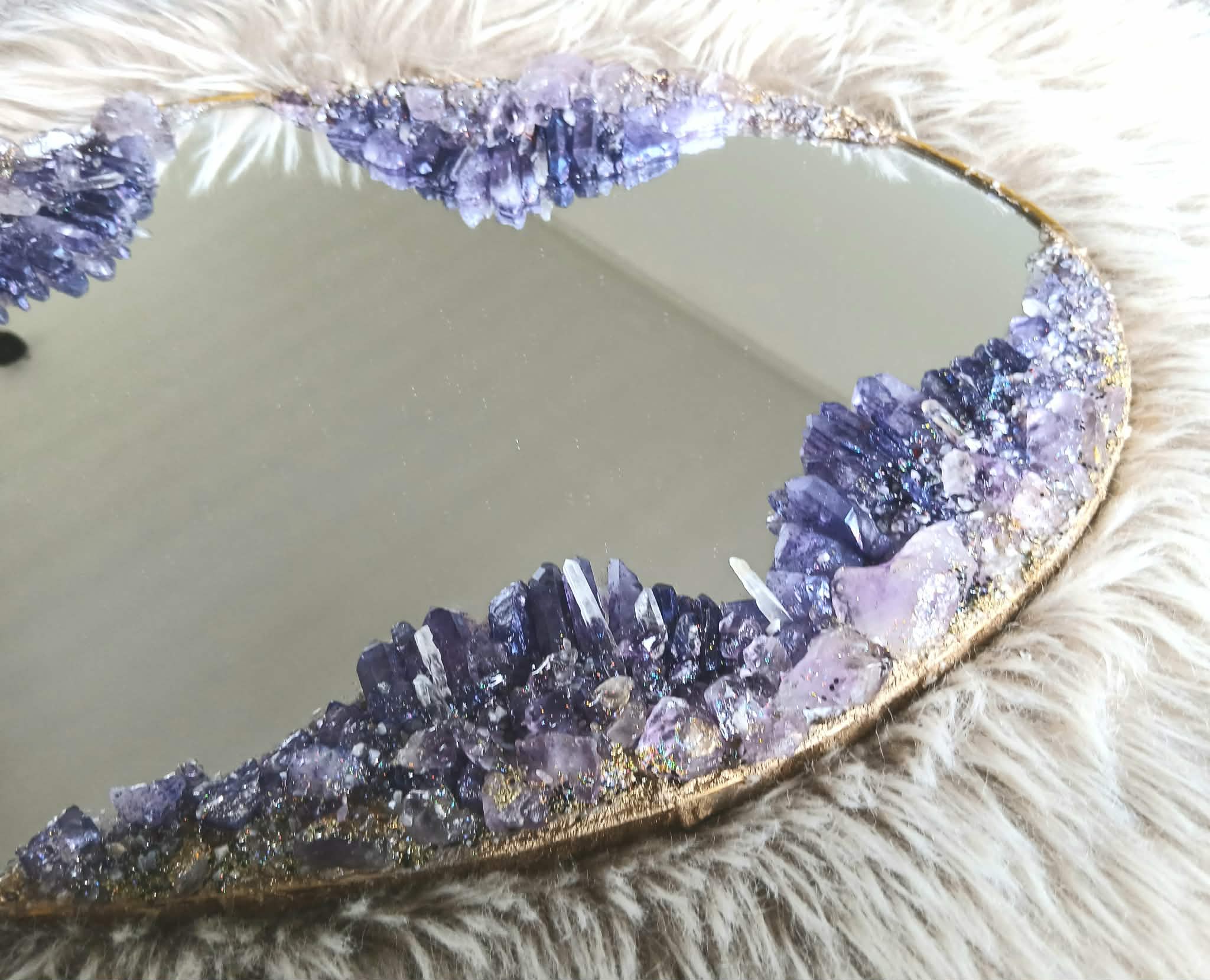 Prachtige geode spiegel vol met ruwe Amethist, Bergkristal punten, Ruwe rozenkwarts, afgewerkt met een gouden randje. Sjiek, zacht, mooi om je interieur mee te stylen.