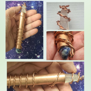 De koperen buis is gevuld met de gouden driehoek (amethist, rozekwarts, bergkristal) en heel veel kopervezels, verwerkt als orgone transformator in de kern van de buis.
