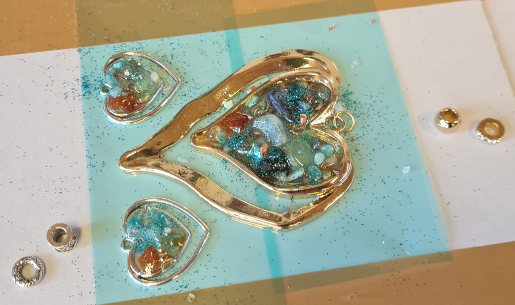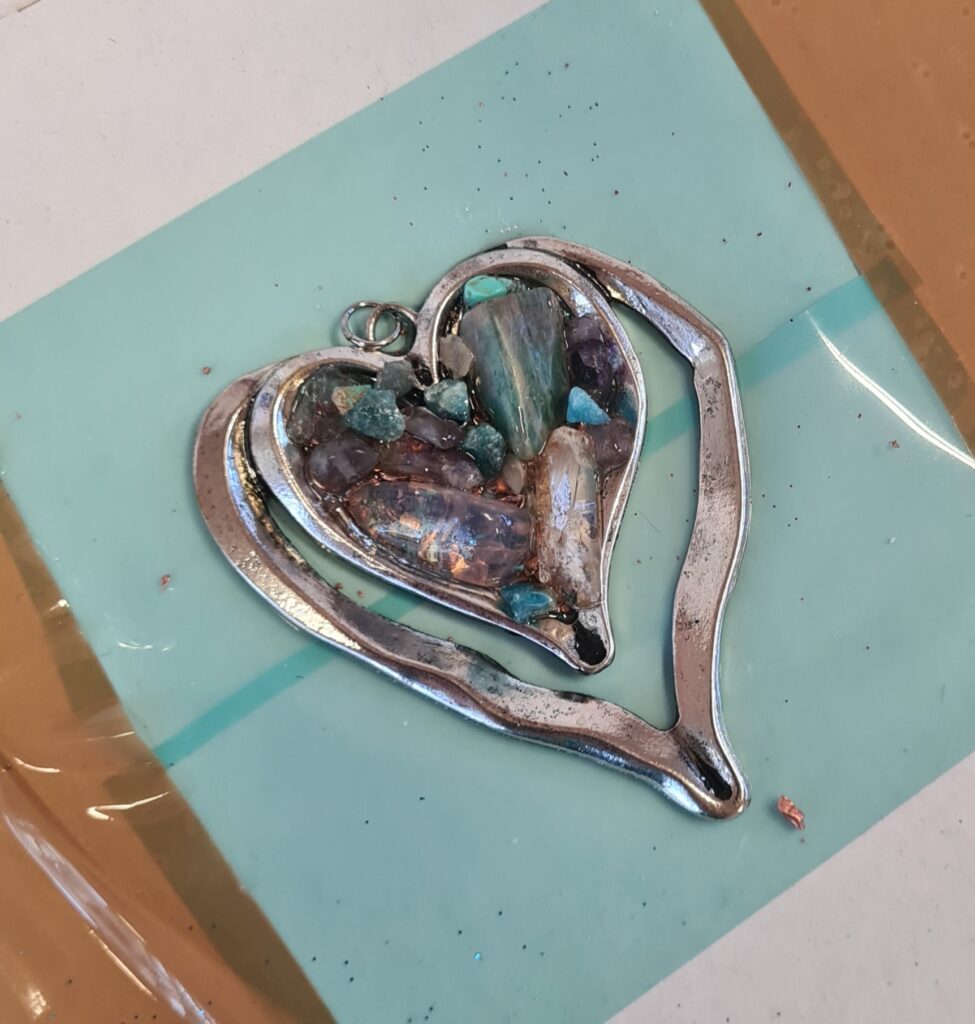 In dunne laagjes gekleurde hars ga je druppelsgewijs jouw Heartwhisper opbouwen met edelstenen en kristallen die je mooi vind.